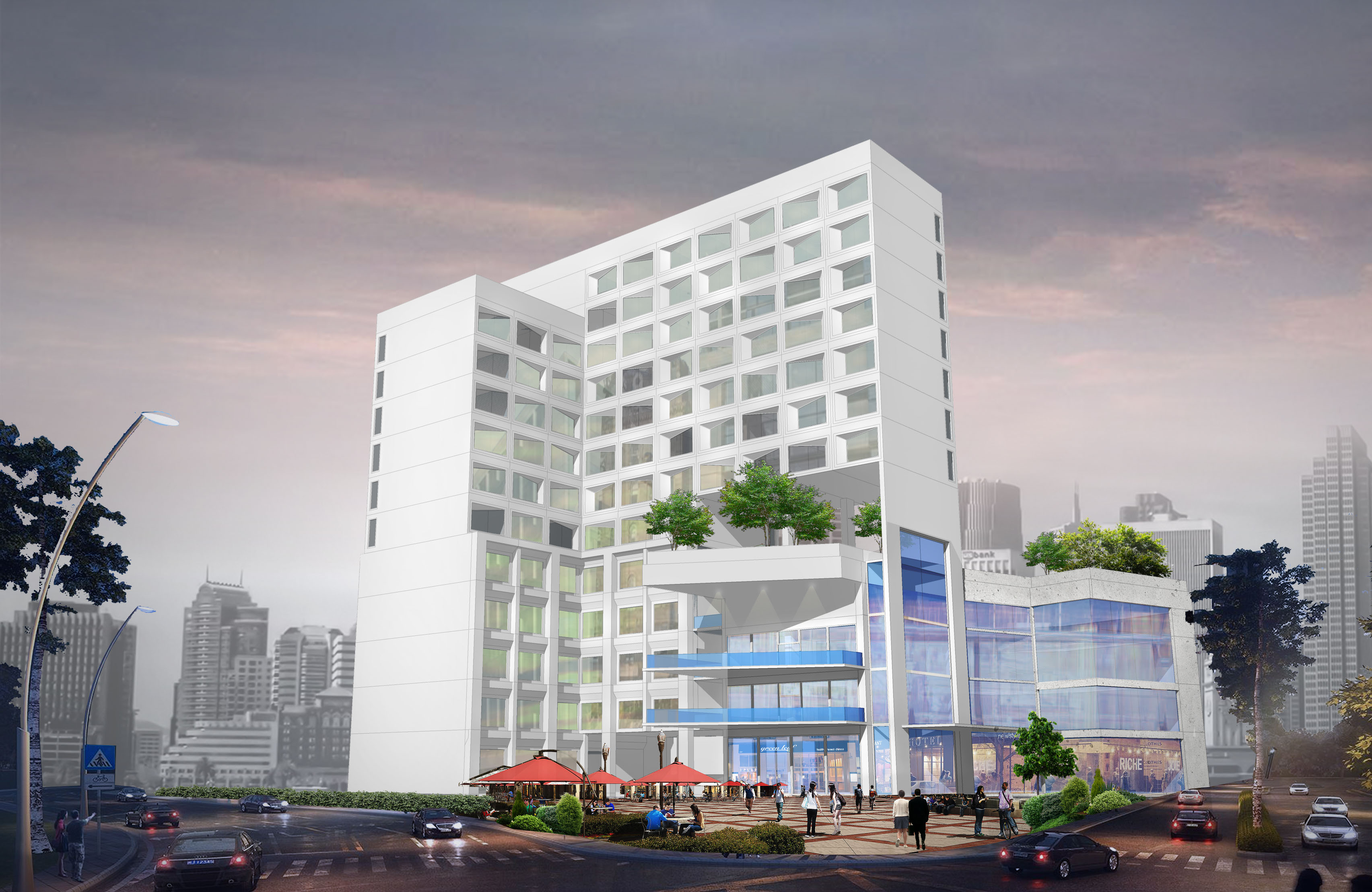 Project site is located close to the exit/entry point of a major highway connecting Jakarta and Bogor. The potential of the site as a stop point for travellers make a prime location for a business hotel. This 13-storeys business hotel is complimented with retail center on the podium, swimming pool, conference facilities and restaurants.