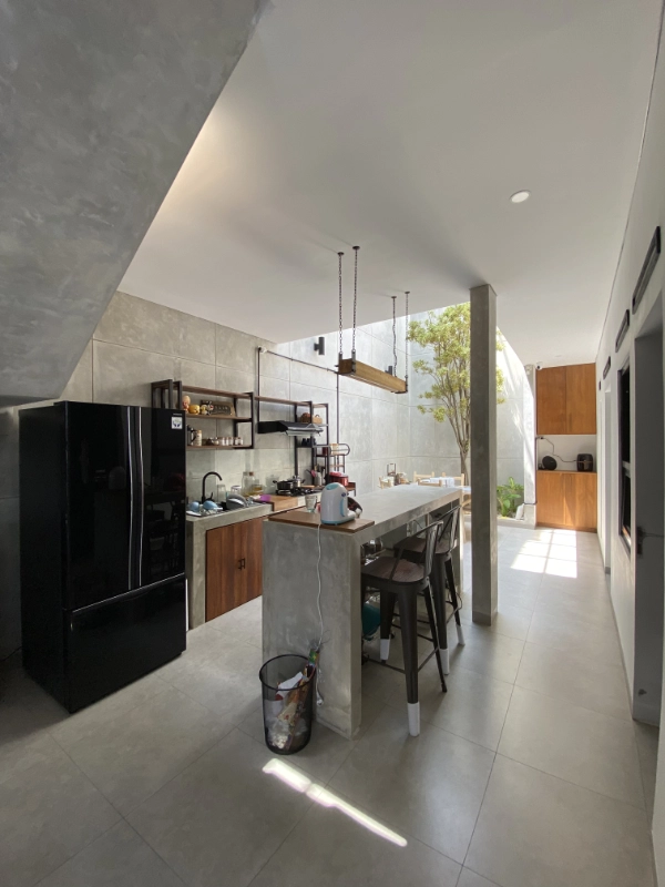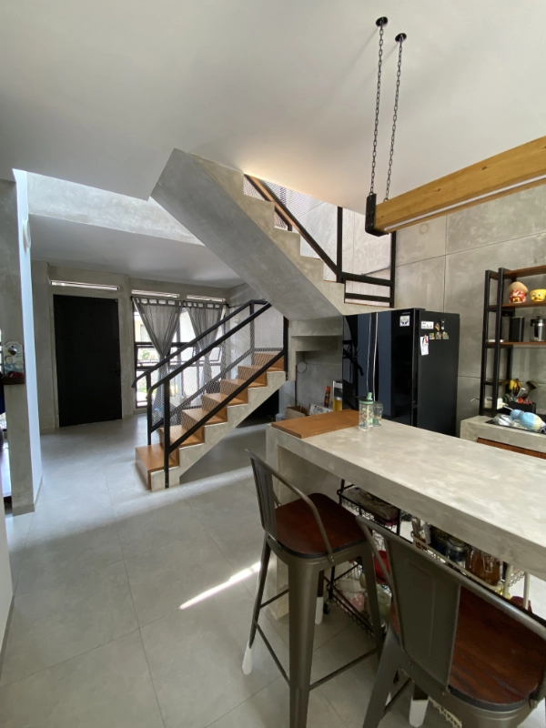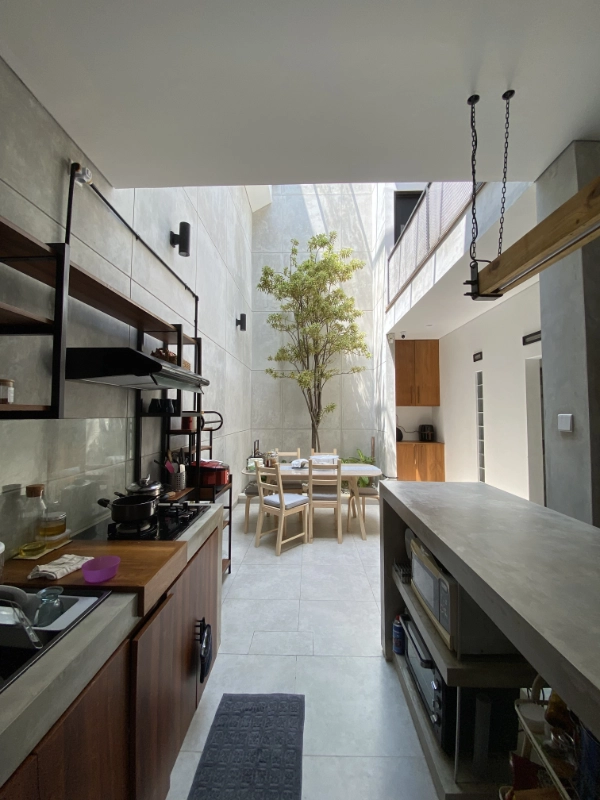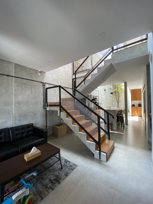 The interior uses gradient tone of white, gray and black to achieve a simplistic industrial theme. Coupled with timber accent for the stair, flooring as well as cabinets offering warm vibe of a home.
