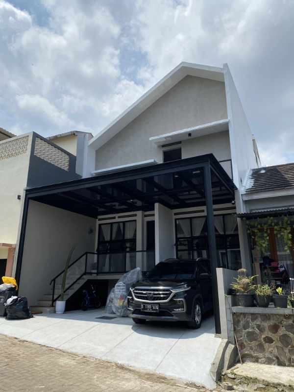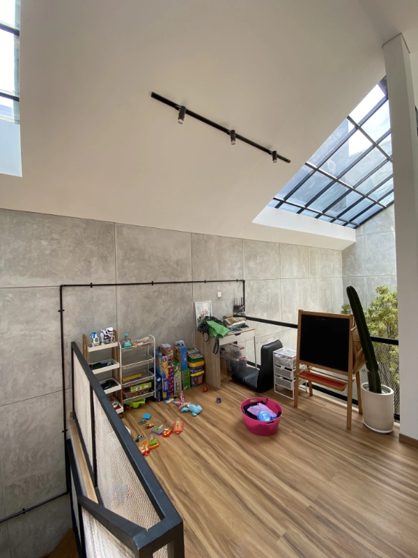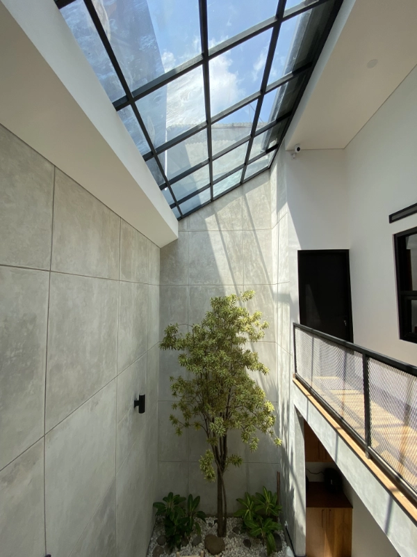 Asymetrical facade and roofline were proposed to create a more dynamic look of the house compare to the surrounding units. The design is making sure this elongated house still get enough natural light and good air circulation. This is achieved by providing two transparent roof above the dining room and the stair area as well as cross ventilation throughout the house.
